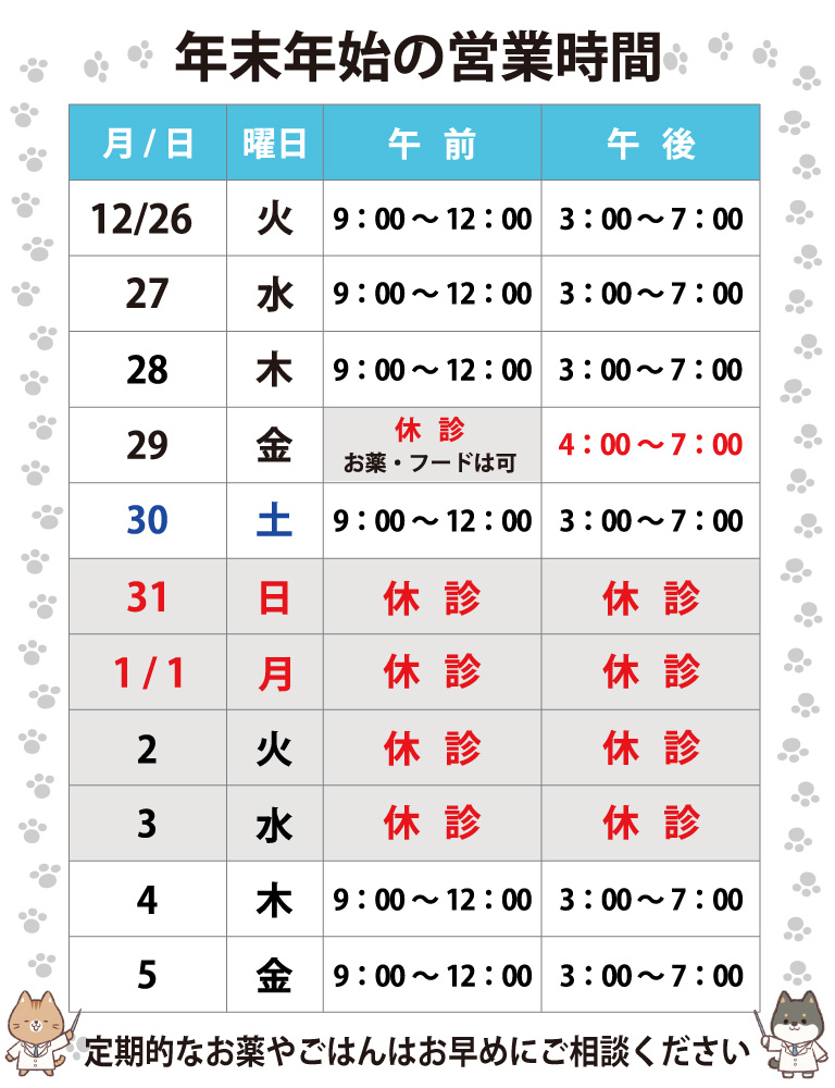 【2023年】バァレー動物病院の年末年始のスケジュールに関しまして